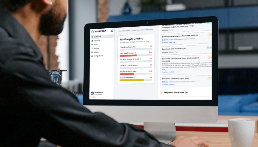 A Miravaga é seu copiloto de carreira. Analisamos seu currículo contra a vaga desejada e entregamos um plano de ação claro para você chegar à entrevista.
